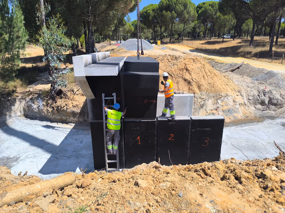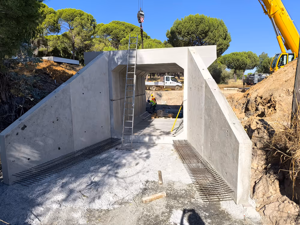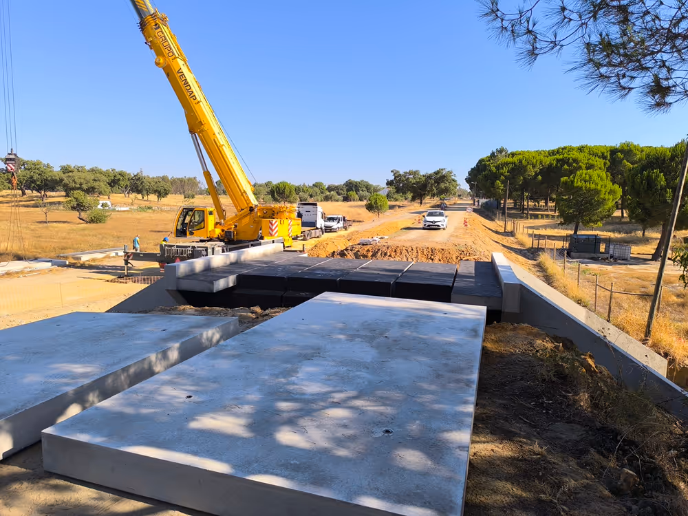 A Sirolis forneceu os elementos prefabricados em betão para a construção de uma passagem hidráulica em betão, em perfil de estrada, composta por peças tipo box-culvert com secção útil de 3,5 x 3,5 m. A obra integrou também muros ala para contenção dos taludes, assegurando a estabilidade estrutural e a continuidade da circulação rodoviária. O rigor técnico aplicado no desenvolvimento e produção das peças garantiu eficiência hidráulica, segurança da via e uma solução resistente e duradoura, em respeito pelo meio envolvente.